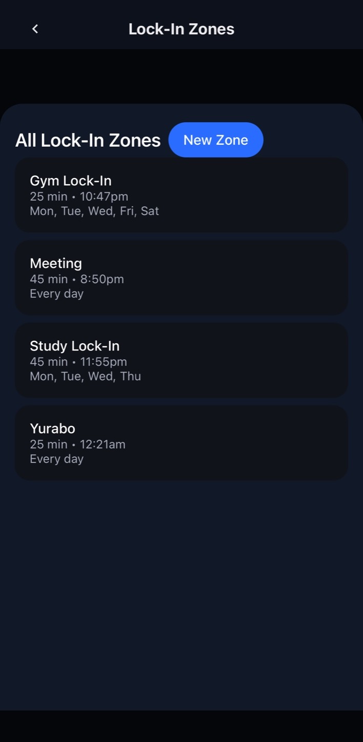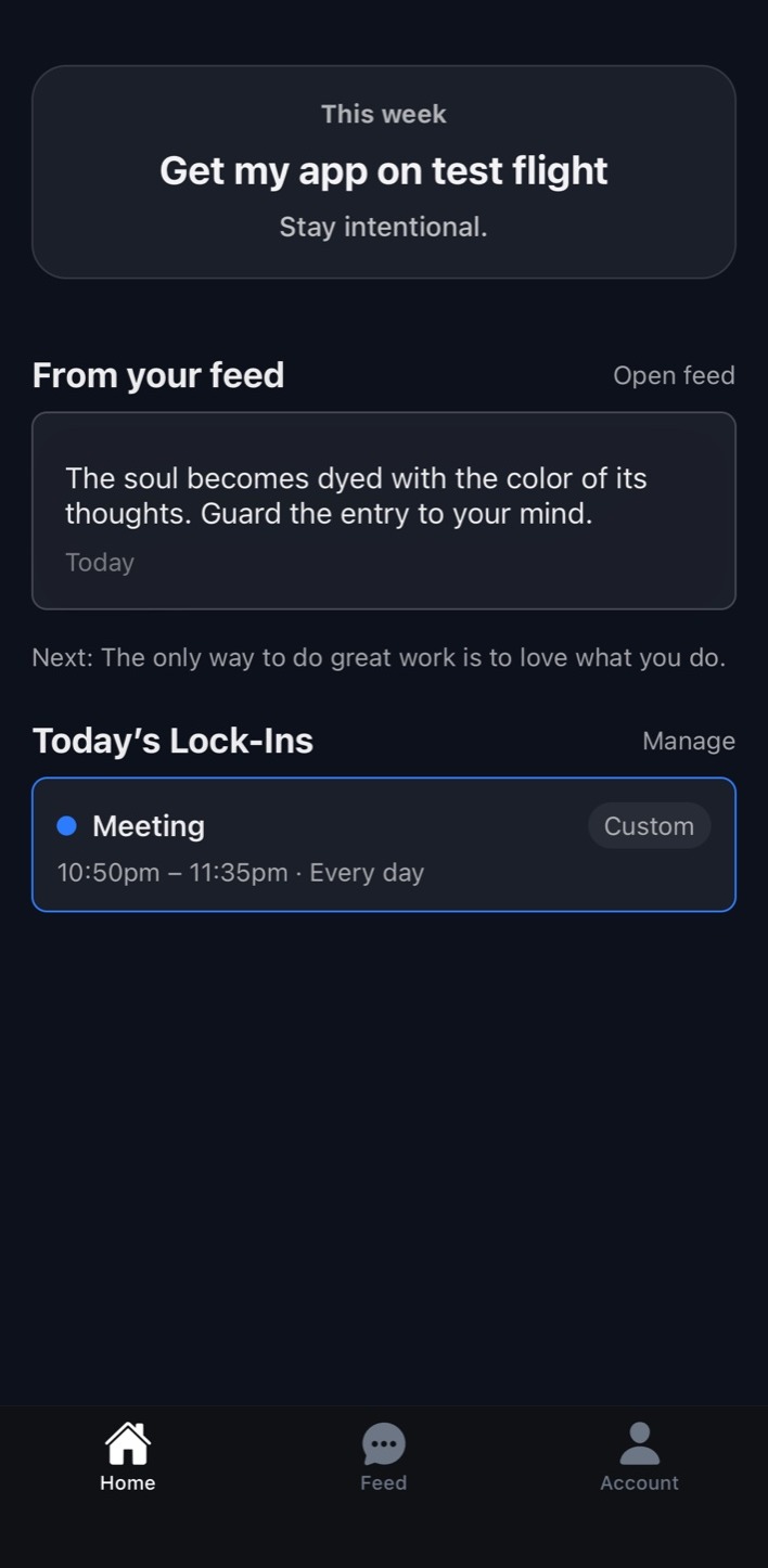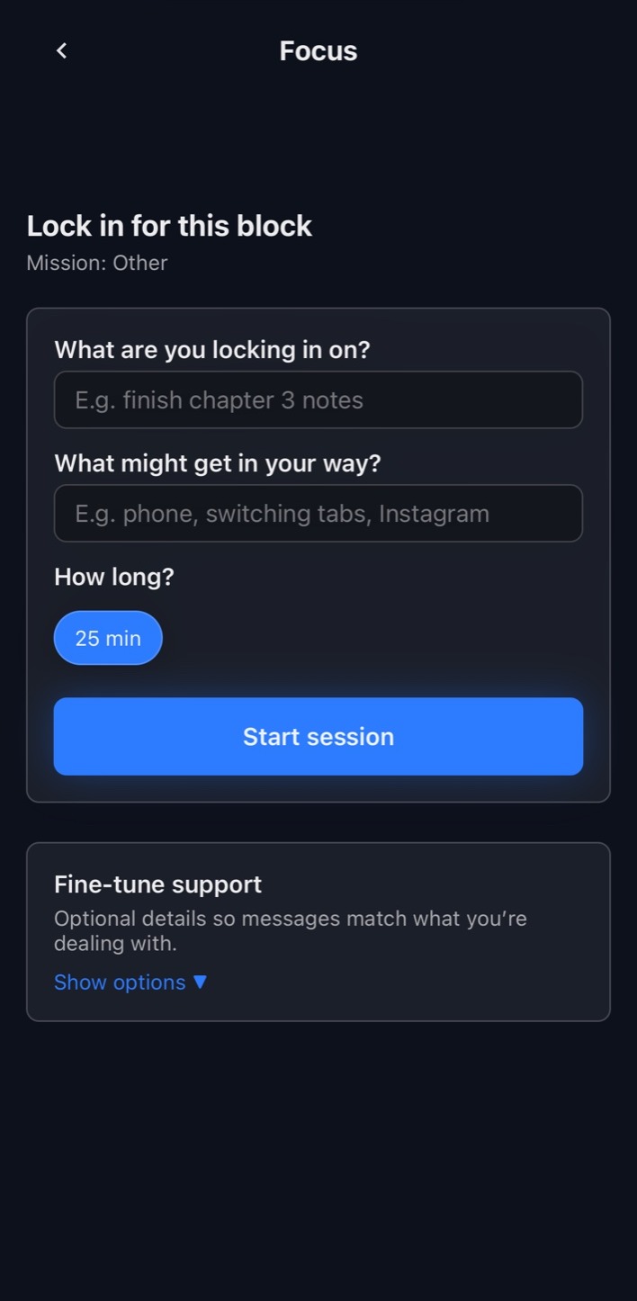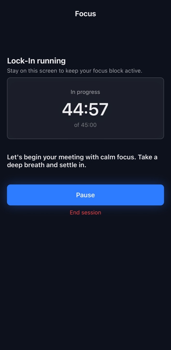 Set what you’re locking in on, choose a duration, and begin your focus block.