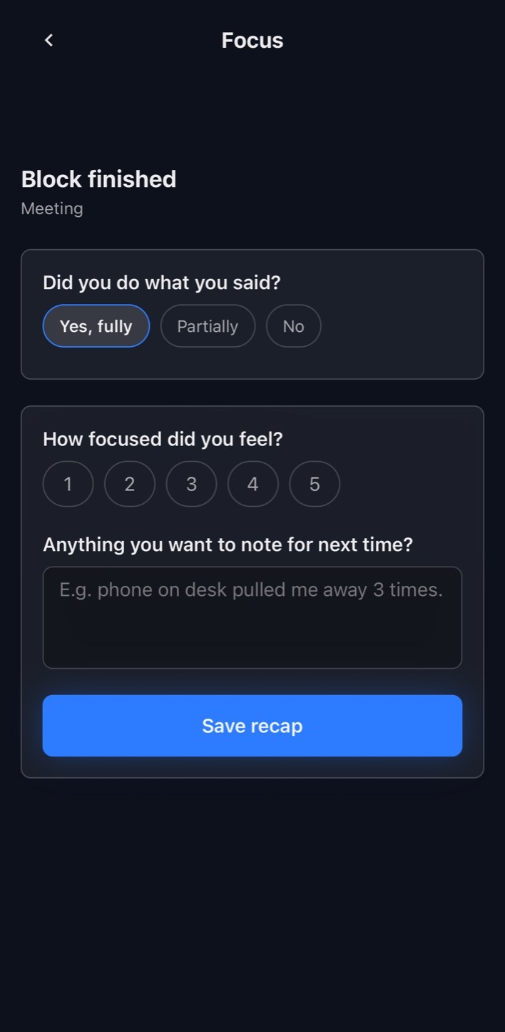 After each block, quickly capture whether you did what you said and how focused you felt.